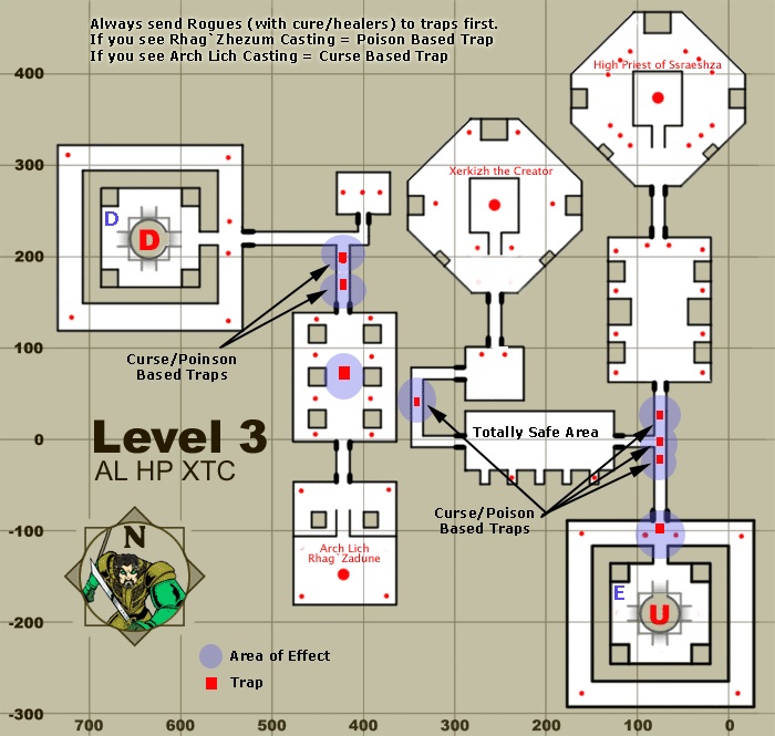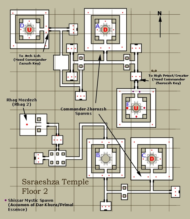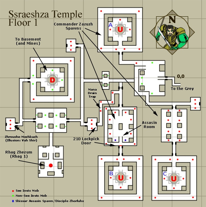 || Strategy DescriptionSsraeshza Temple is the last remnant of the once massive Shissar Empire of Kunark, the enslavers of the iksar race. Following the Greenmist that drove them out of Kunark, they were thought extinct, when in actuality they used their magics to move themselves to Luclin. In their desperation to avoid the Greenmist a second time, they created a dome over the Grey, sealing it off from the outside and creating a vacuum inside. Within the Grey, they built their last, massive temple. DangersUnknown. BenefitsThis is a high level dungeon built to accomodate both raiding parties and single group parties. The temple is in at least 5 levels, the lower of which are designed for single groups. As you move higher up, you may require more support, and there are many unique areas and creatures to fight along the way. To reach the "boss" of the zone, you will require a key made of a container and three parts. This key drops off of randomly placed unique monsters on levels 1-4, a different component on each floor. Each person wishing to move to the highest level will need a key to do so. Travelling To and From Ssraeshza TempleThe temple can be found in the middle of the Grey. There is a passage that leads from the Deep to the Temple, but is blocked on this side by a one-way door. People can enter from the Deep, but after passing through the one-way door, can not go back out that way. |